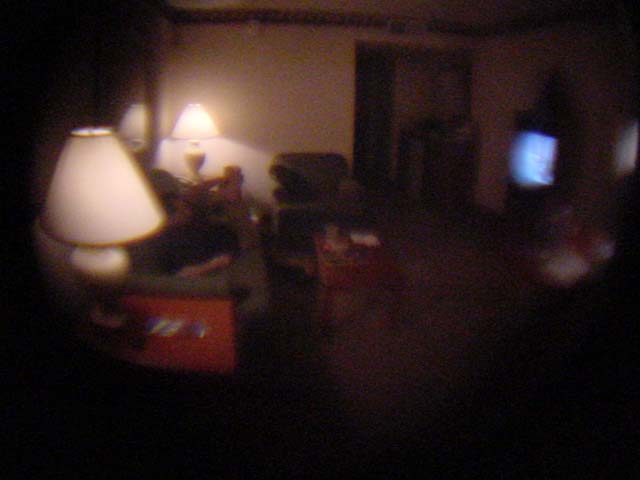 | I turned the peephole on Traweek's hotel room inside out. Jay later came by and took a picture thru the backward peephole. Here is Traweek watching TV thru a peephole. | ||