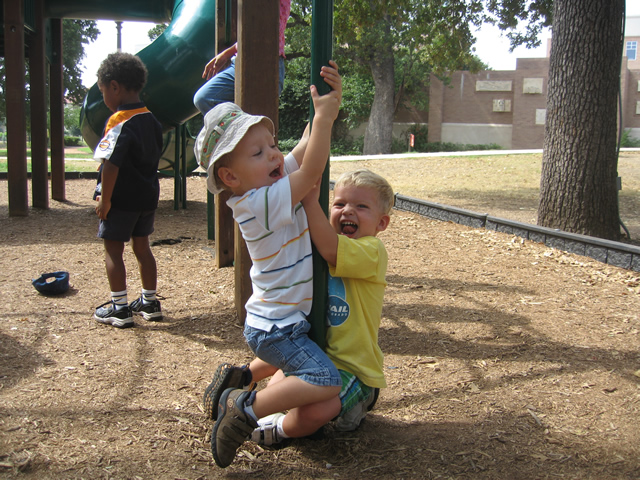 | Here is a pic of Toby and his best bud, Jameson, at the park. Those guys were hiliarious, running all over and have races on the dual slides. | ||