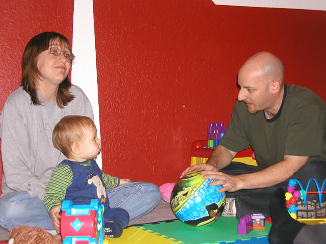 | Uncle Jeremy came into town for the holiday. Here he is playing with the Tobinator. Kimberly watches on to chaperone. | ||