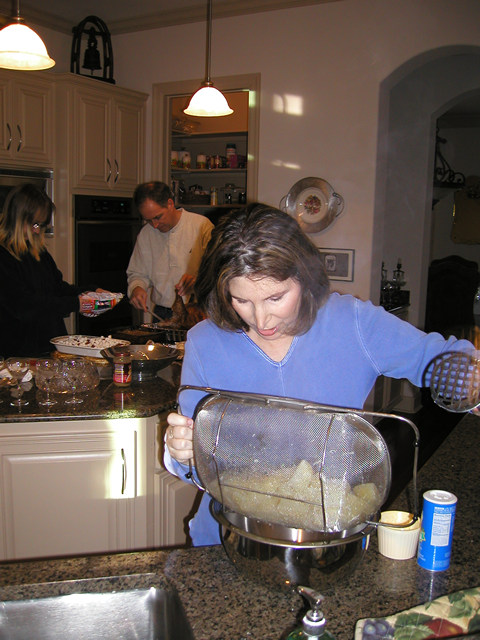| Here is my mom making mashed potatoes for Thanksgiving. Cal's in the background checking out what's right under the turkey leg. Kim's putting marshmellows on the yams and I'm taking the photo. | ||
